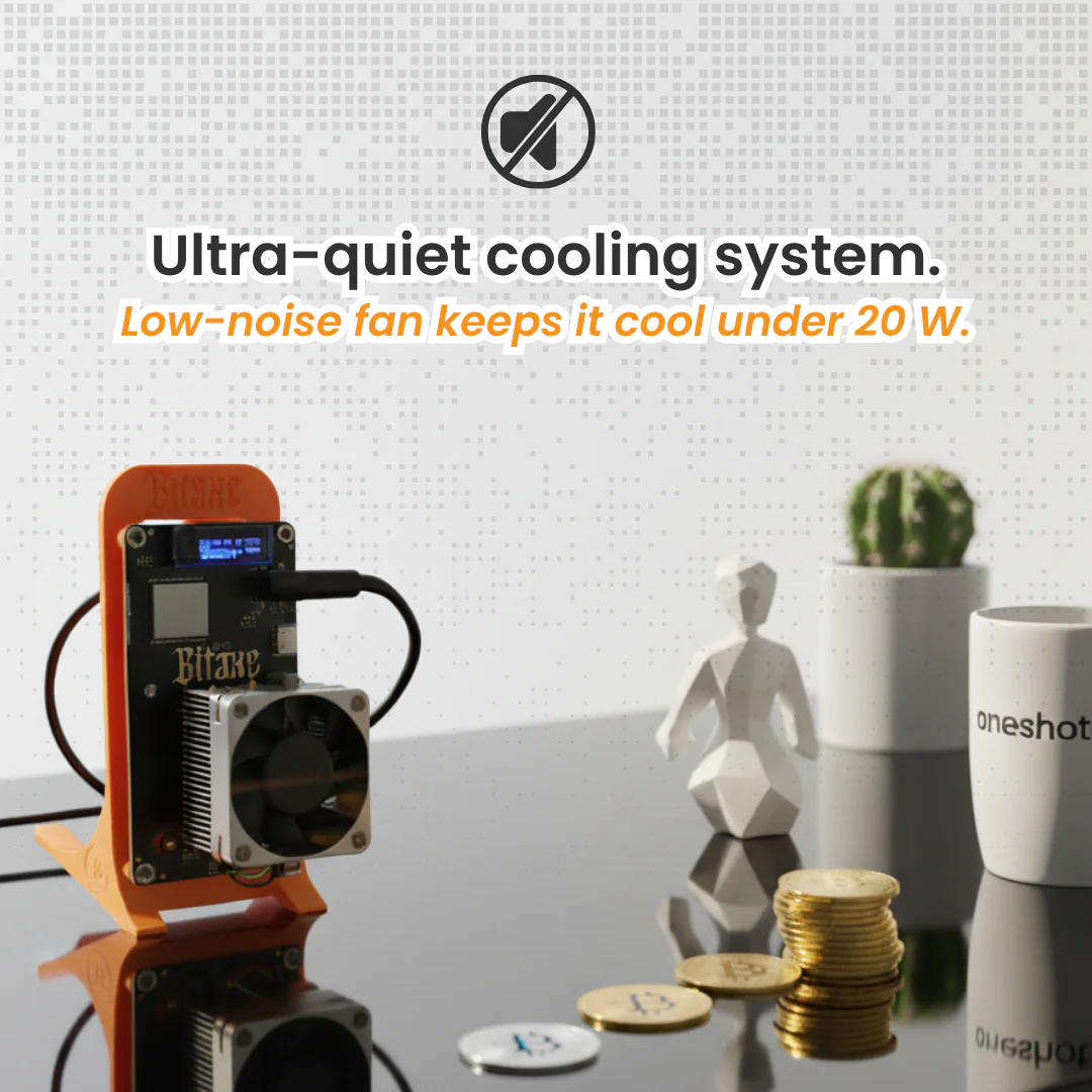 The MineOne is a plug-and-play Bitcoin mining device that runs automatically, 24/7. It connects securely to your Wi-Fi and the Bitcoin network, generating continuous mining attempts (“shots”) for the full Bitcoin block reward. With no moving parts, no maintenance, and power usage lower than a nightlight, it’s built to run quietly for years — backed by a lifetime warranty.